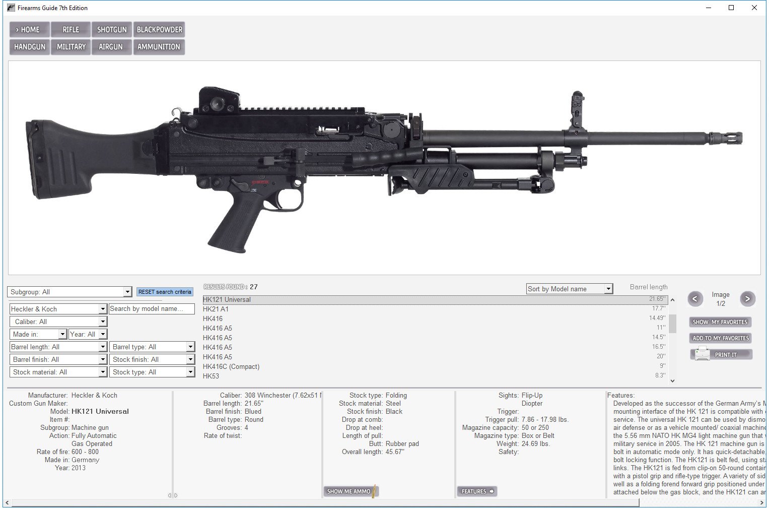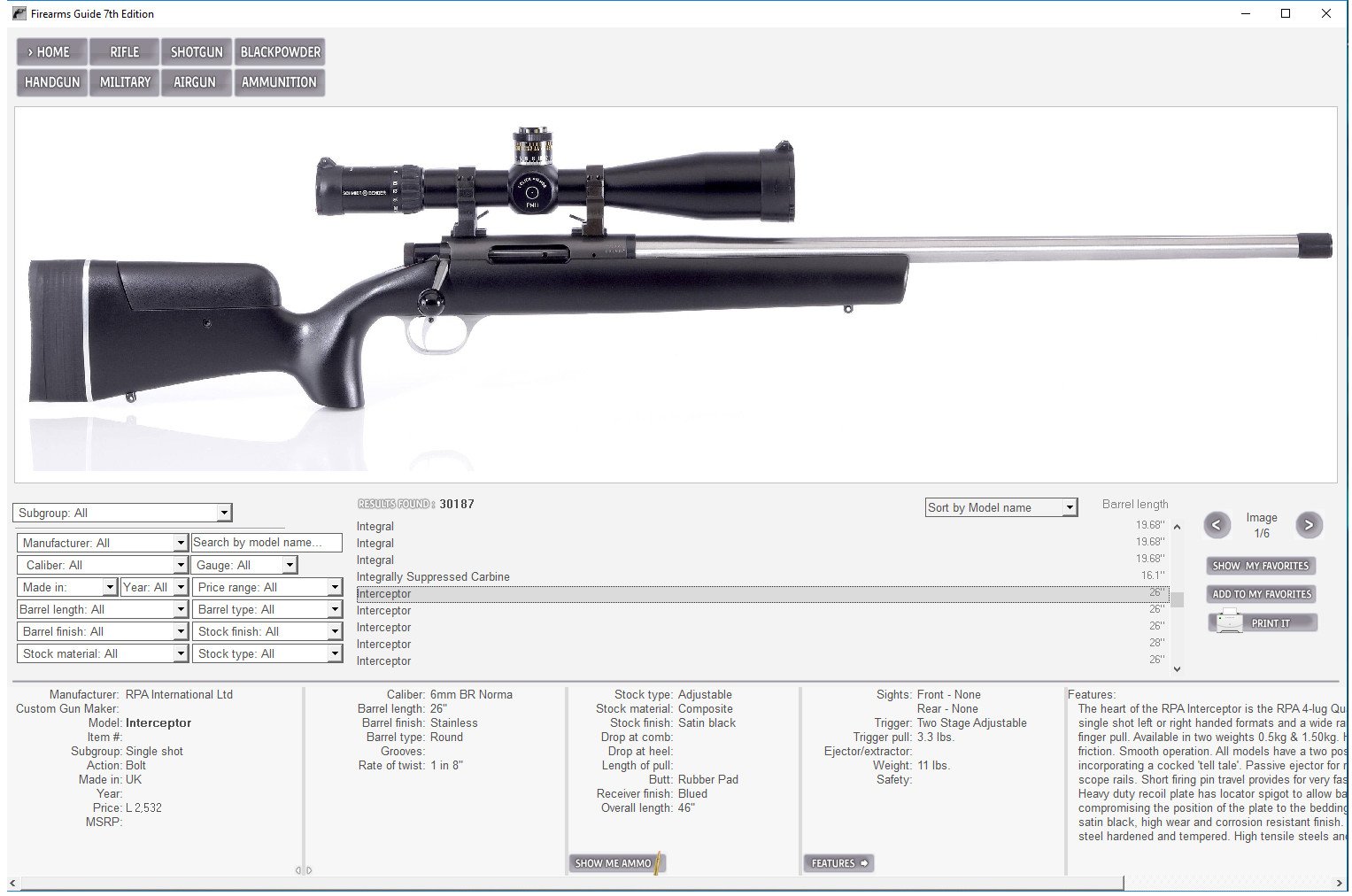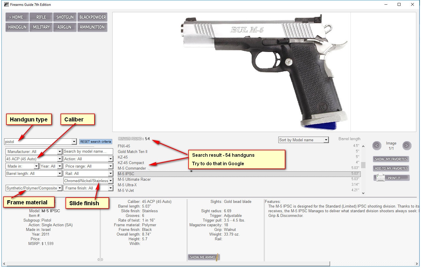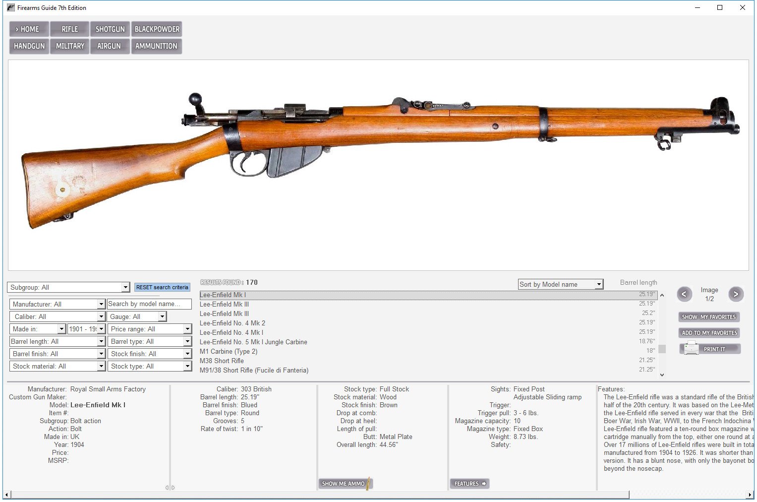 • Computer searchable with 14 different search criteria! Search by caliber, model, manufacturer, action, country of origin, year of production, barrel length, stock type, gun finish and find any gun in a second. Combine more search criteria in one search to perform complex searches that cannot be done with Google.
