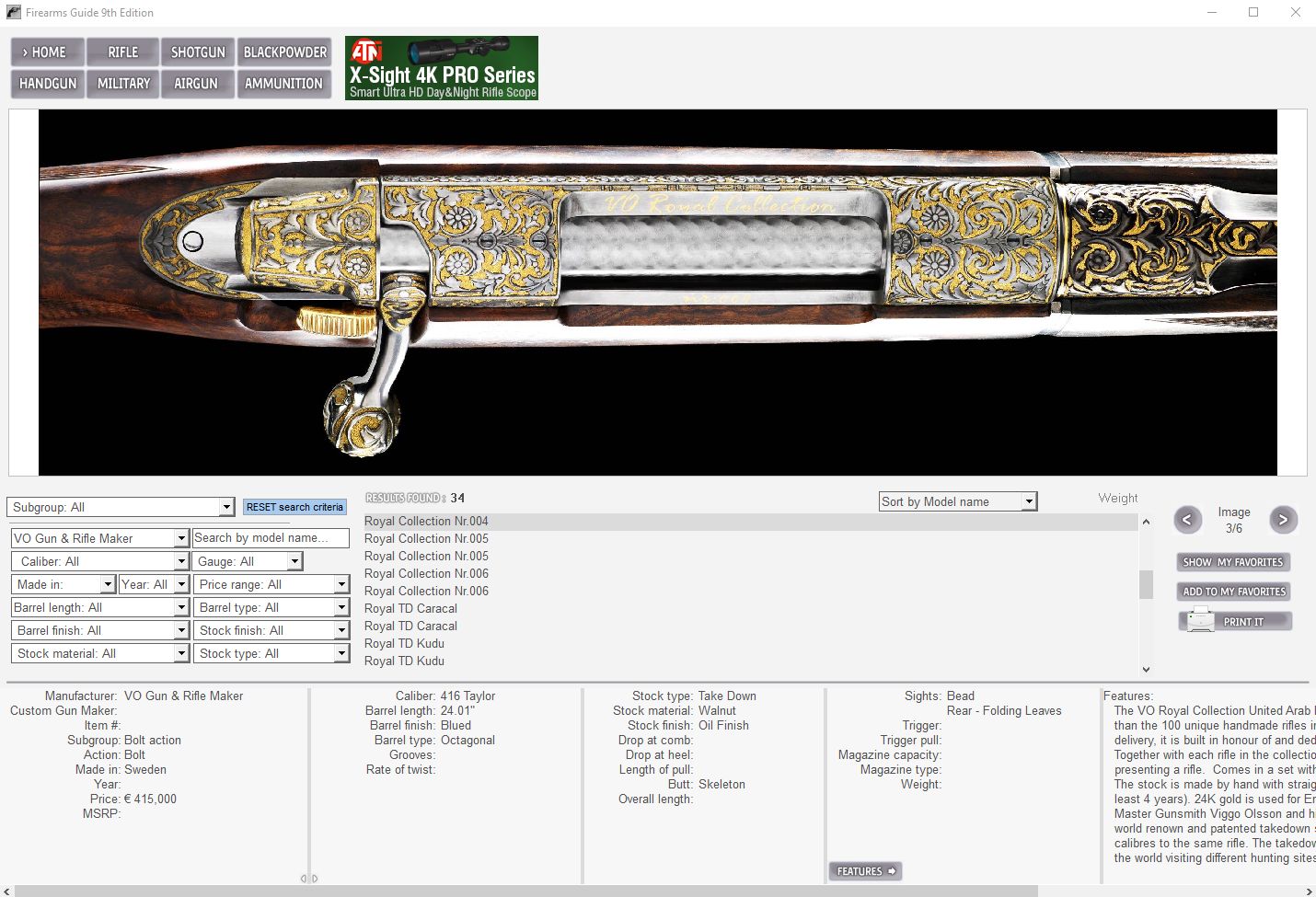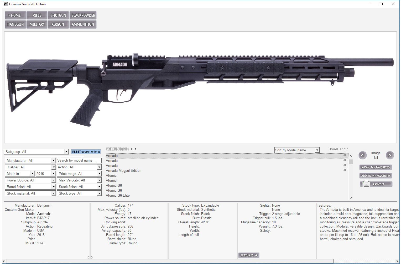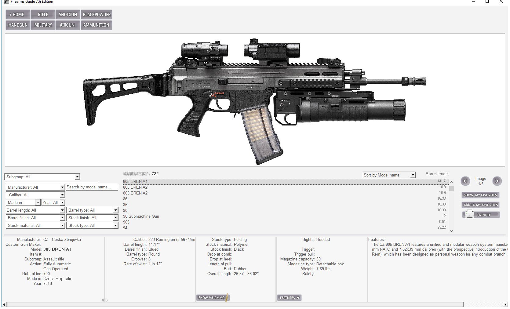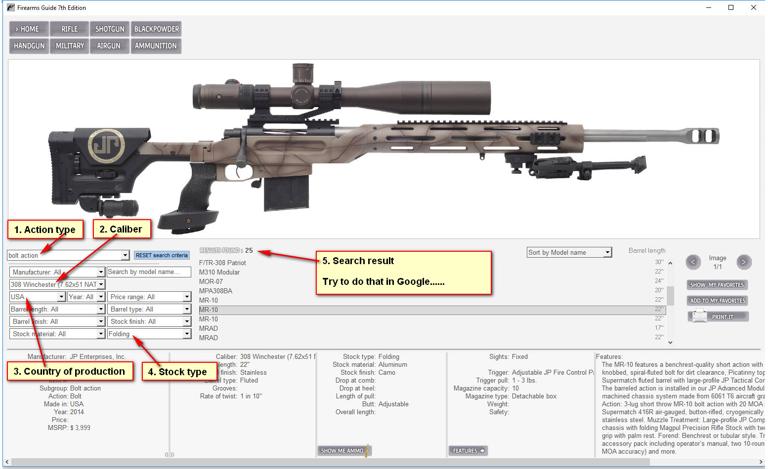 • Computer searchable with 14 different search criteria! Search by caliber, model, manufacturer, action, country of origin, year of production, barrel length, stock type, gun finish and find any gun in a second. Combine more search criteria in one search to perform complex searches that cannot be done with Google.